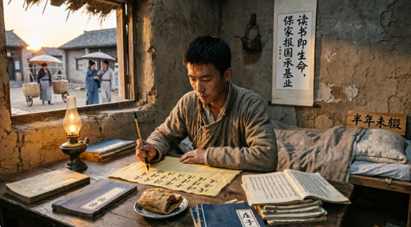 庄子京少时家贫无缘学堂,却深知读书兴家、文化报国的道理,牢记先祖“读书即生命,保家报国承基业”的家训。他白天摆摊谋生,夜晚向文人请教,即便染病卧床半年,也从未放下书卷,苦读之下精通古典名著,更练就一手工整欧体行书。