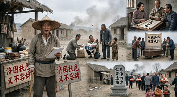 同族五兄弟四人病残、生计断绝,他牵头搭起杂货摊,帮其安家立命;乡邻周五丧妻、六子嗷嗷待哺,他奔走游说族长,托孤富户保全稚子;外姓寡妇病逝无人安葬,他发动族人募捐置棺,让逝者入土为安。