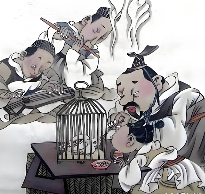 昔者海鸟止于鲁郊,鲁侯御而觞之于庙。奏《九韶》以为乐,具太牢以为膳。鸟乃眩视忧悲,不敢食一窗,不敢饮一杯,三日而死。此以己养养鸟也,非以鸟养养鸟也。《庄子·至乐》