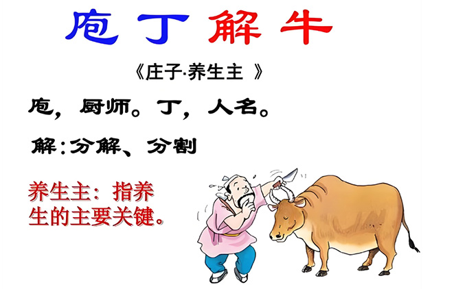 庖丁为文惠君解牛。手之所触,肩之所倚,足之所履,膝之所跨,表然响然,奏刀骋然,莫不中音。文惠君赞叹其技艺之妙。庖丁释刀云:平生宰牛数千头,而今宰牛时全以神运,目‘未尝见全牛’,刀入牛身若‘无厚入有间’而游刃有余。因此牛刀虽已用了十九年,而其锋利仍‘若新发于硎’。《庄子·养生