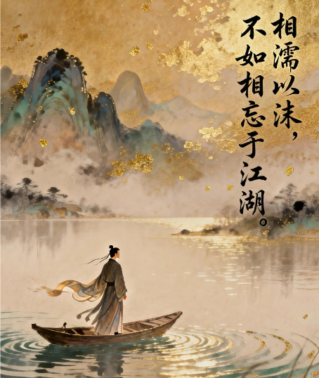 “泉涸,鱼相与处于陆,相呴以湿,相濡以沫,不如相忘于江湖。与其誉尧而非桀也,不如两忘而化其道。”