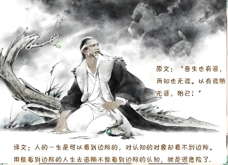 释意:支离叔和滑介叔俩人在冥伯之丘上和昆仑之虚游览美景,这里是黄帝曾经休息的地方。不一会儿,滑介叔的左肘上长出了一个瘤子,他显得急躁不安,好像很厌恶它。支离叔说:“你讨厌这东西吗?”滑介叔说:“没有,我怎么会讨厌它呢!生命来到世上,不过是一时的寄托罢了;人的生命形体上派生的东西,犹如尘垢的一时集聚。人的生死就犹如白天与黑夜的自然交替运行一样。况且我跟你一道观察事物的变化,如今这变化来到了我身上,我又怎么会讨厌它呢!”