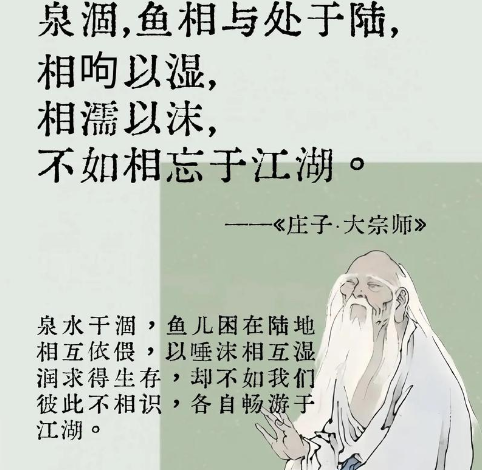 在人际关系上,庄子推崇“相忘于江湖”的境界,反对刻意维系关系或执着于世俗评价。在社交媒体时代,人们易被外界标准困扰,庄子的思想鼓励我们回归本真,建立更轻松、真诚的联系,不为他人眼光所累。